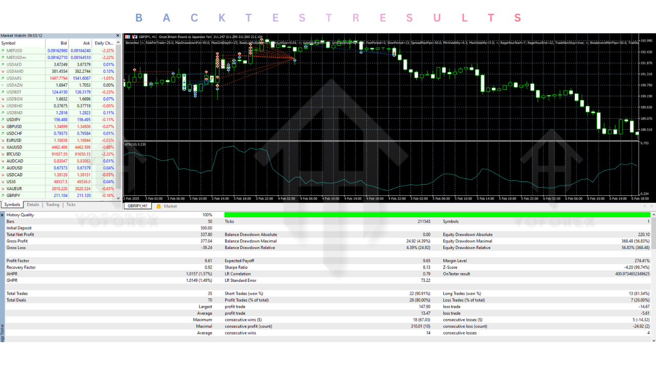 - Profit Factor: On GBPJPY H1, the EA achieved a Profit Factor of 2.35, indicating a high return relative to the risk taken.