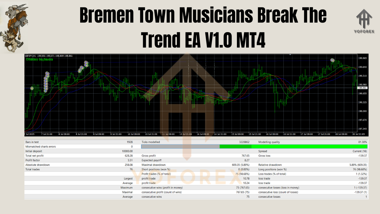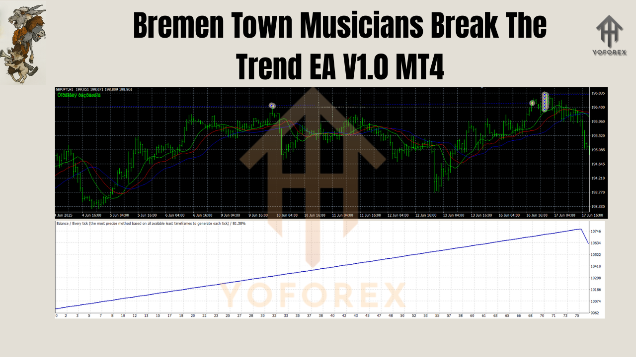 Bremen Town Musicians Break The Trend EA V1.0 is a MetaTrader 4 Expert Advisor that focuses on counter-trend trading — taking reversal setups when market exhaustion is confirmed.