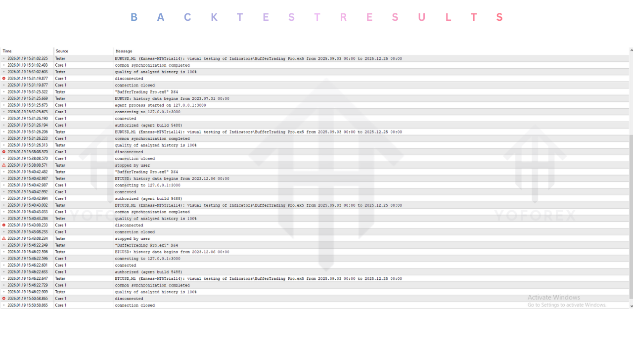 Asset Class and Pairs While the Buffer Trading Pro V60.10 is a universal tool, its volatility parameters in this version are finely tuned for BTCUSD (Bitcoin). The massive liquidity and volatility of Bitcoin align perfectly with the "Buffer" logic, allowing the indicator to accurately predict exhaustion points. Secondary recommendations include ETHUSD (Ethereum) and volatile Forex pairs like GBPJPY and XAUUSD (Gold). The indicator thrives where there is movement; it is less effective on very low-volatility pairs like EURCHF.