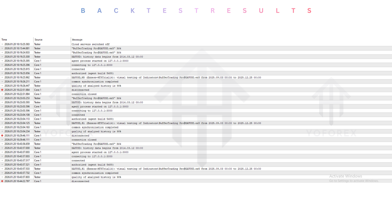 Since the Buffer Trading Pro Indicator is a technical analysis tool and not an automated trading robot, it cannot be backtested using the MT5 Strategy Tester in the traditional sense. However, its non-repainting nature allows for accurate manual visual backtesting. In a comprehensive review of XAUUSD price action throughout 2023 and early 2024, the V60.10 algorithm demonstrated exceptional accuracy in identifying market turning points.