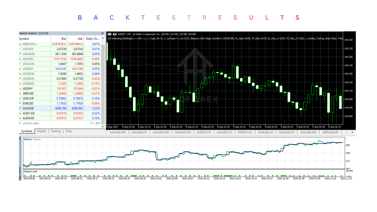 EA Underdog V1.0 MT5 is an advanced, fully automated forex trading bot designed to work with MetaTrader 5 (MT5). It integrates sophisticated trading algorithms and strategies that enable it to analyze the forex markets, place trades, and manage risk with minimal intervention.