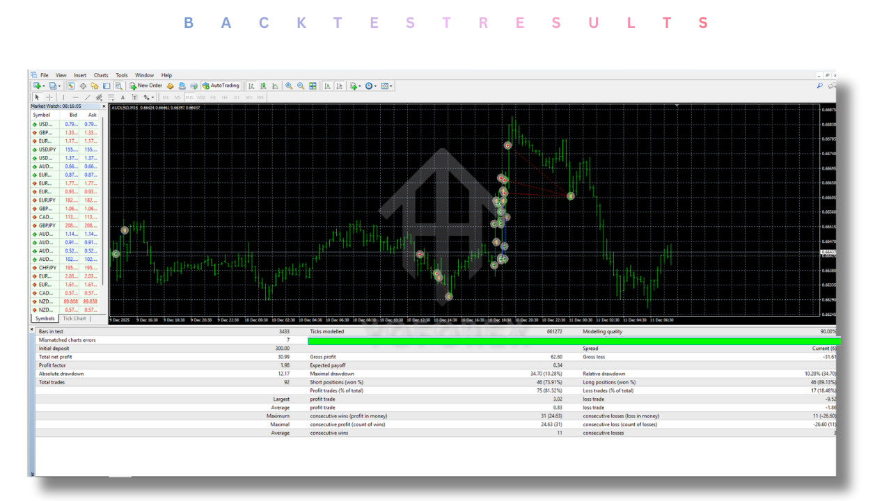 This system is not a high-frequency scalper. Instead, it focuses on clean entries, moderate trade frequency, and structured exits. By analyzing volatility, momentum shifts, and trend confirmation, the EA positions trades only when market conditions align with its internal risk parameters.