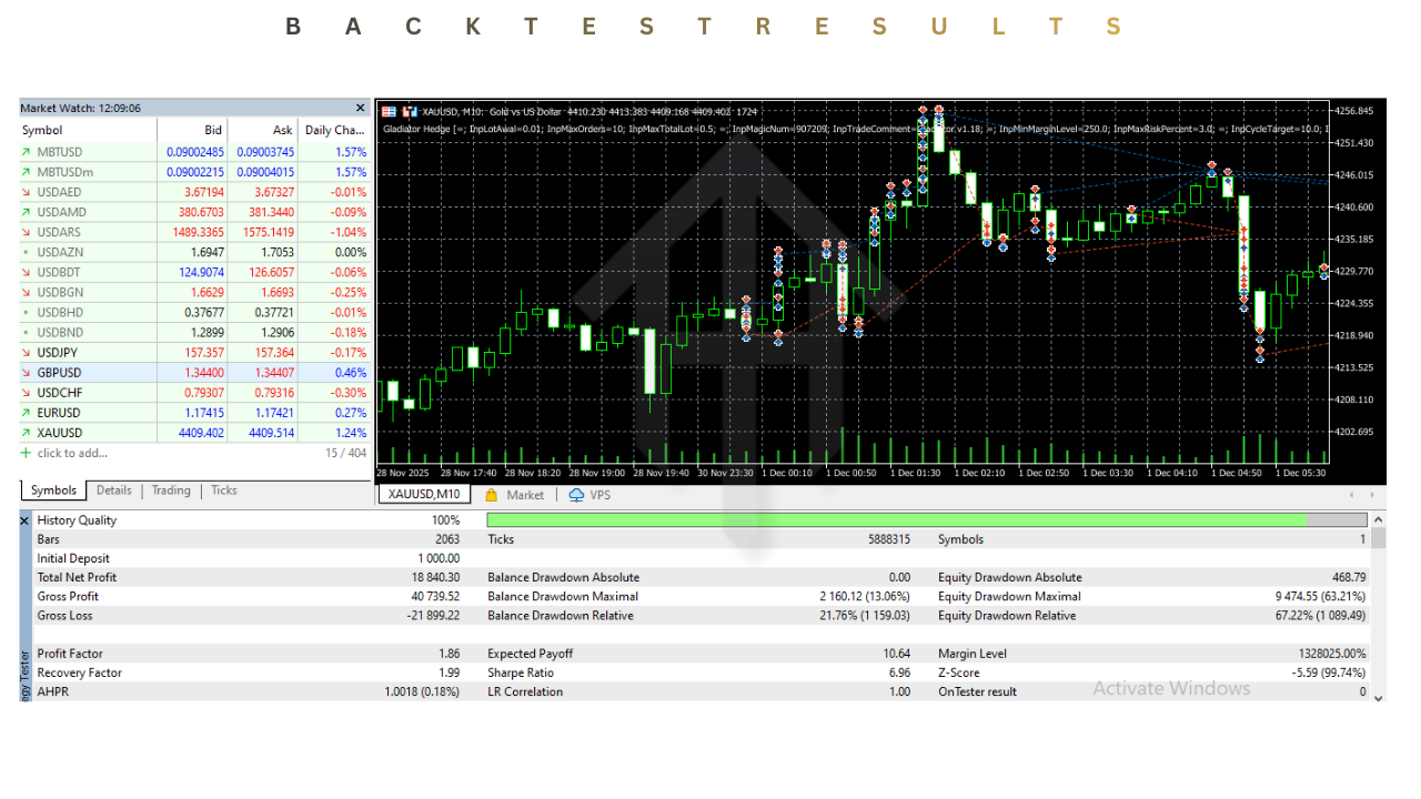 Gladiator Hedge EA V1.18 MT5 was created with this exact pain point in mind. Instead of betting everything on one directional bias, this EA uses structured hedging logic to balance risk, absorb volatility, and keep drawdowns under control. It doesn’t chase the market blindly, and it doesn’t rely on luck either.