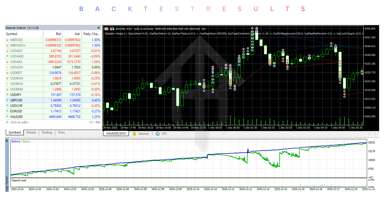 Backtesting for Gladiator Hedge EA V1.18 MT5 shows a steady equity curve with controlled pullbacks, which is exactly what you want from a hedge-based system.