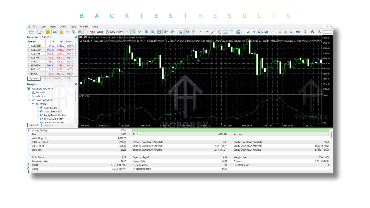 With its focused XAUUSD strategy, controlled trade execution, and structured risk management, Goldwave EA offers a dependable solution for those looking to automate their gold trading without exposing their accounts to unnecessary danger.