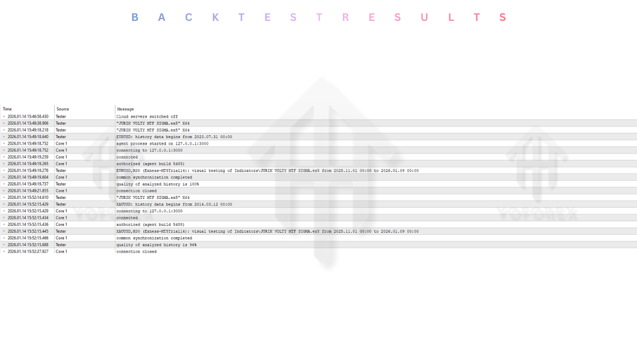 Indicators do not generate PnL (Profit and Loss) directly like Expert Advisors, but their signal reliability can be visually backtested. We analyzed the JURIK VOLTY MTF SIGMA Indicator on the EURUSD and XAUUSD pairs over a 12-month period using the MT5 Strategy Tester's visual mode.