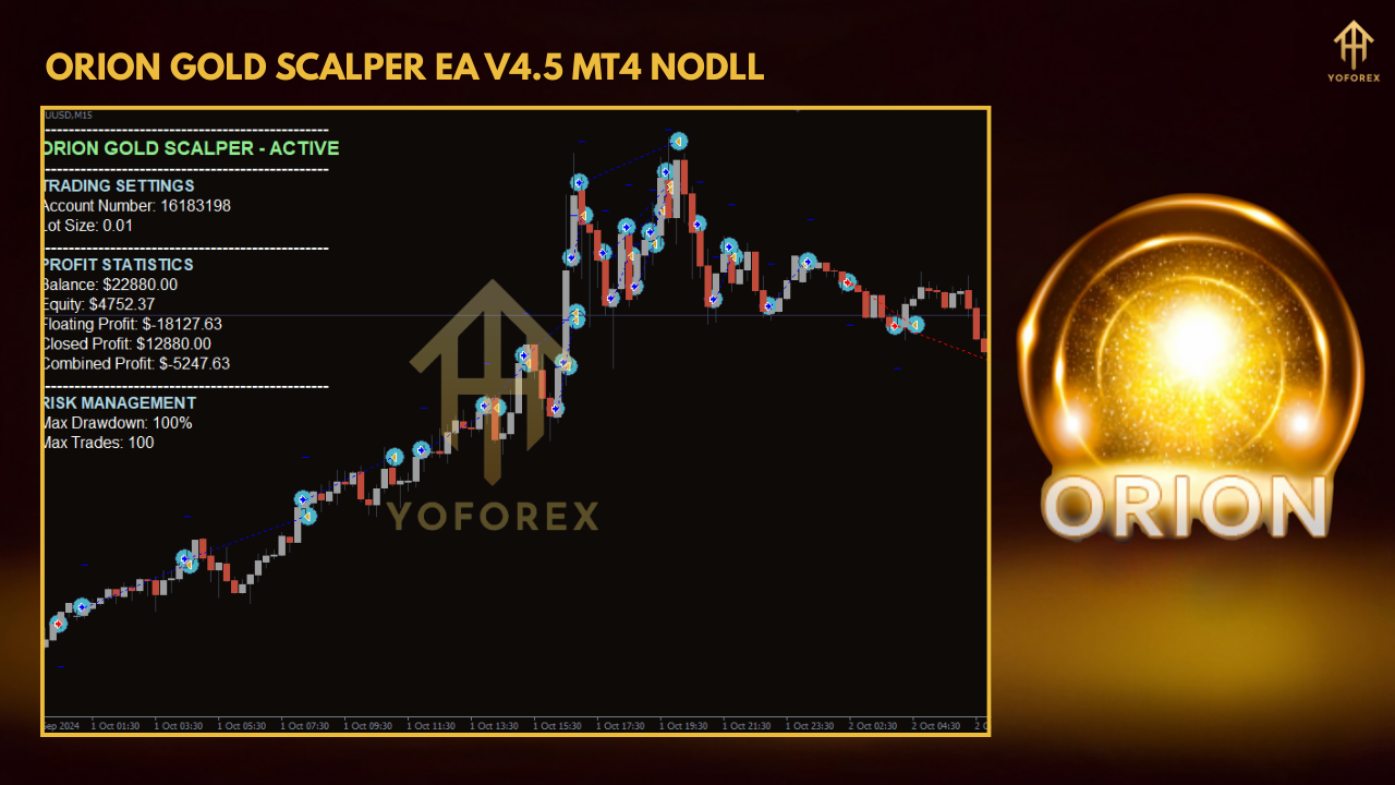 Orion Gold Scalper V4.5 MT4 is a lightweight, fully automated gold scalper EA designed for MT4. Built by YoForex’s veteran developers, it zeroes in on small intra-day moves in the XAUUSD market, targeting 1–2% daily gains while capping drawdowns at 5%. Unlike many robots that rely on fancy curve-fitting, Orion’s algorithm analyzes real-time price action, volatility bursts, and session overlaps to identify high-probability setups.