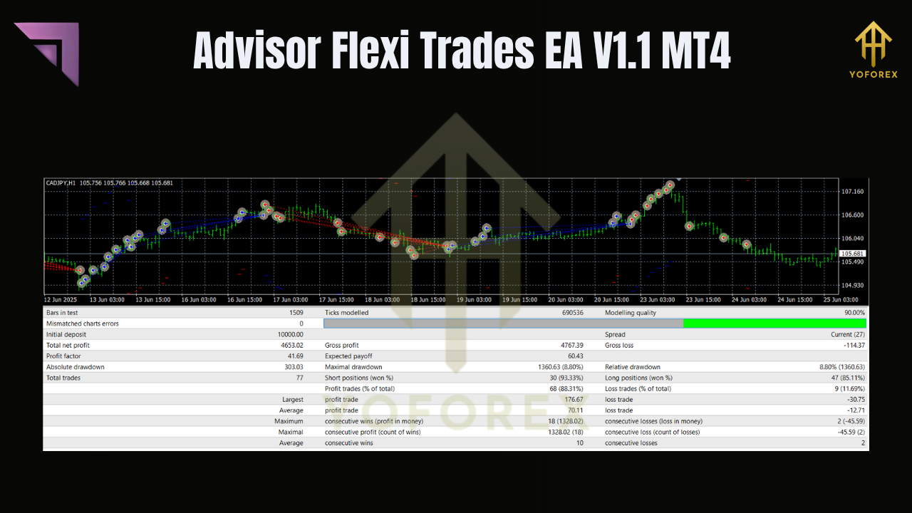 Advisor Flexi Trades EA V1.1 MT4 is a versatile, fully back-tested MT4 expert advisor designed to automate your forex strategy across major currency pairs. Unlike rigid bots tuned for a single pair, Flexi Trades EA supports EURUSD, GBPUSD, USDJPY (and any other pair you fancy), with a primary focus on M15 and H1 timeframes. It uses dynamic risk algorithms, market-structure analysis, and customizable filters to adapt in real time—so you won’t have to manually switch profiles when conditions change.