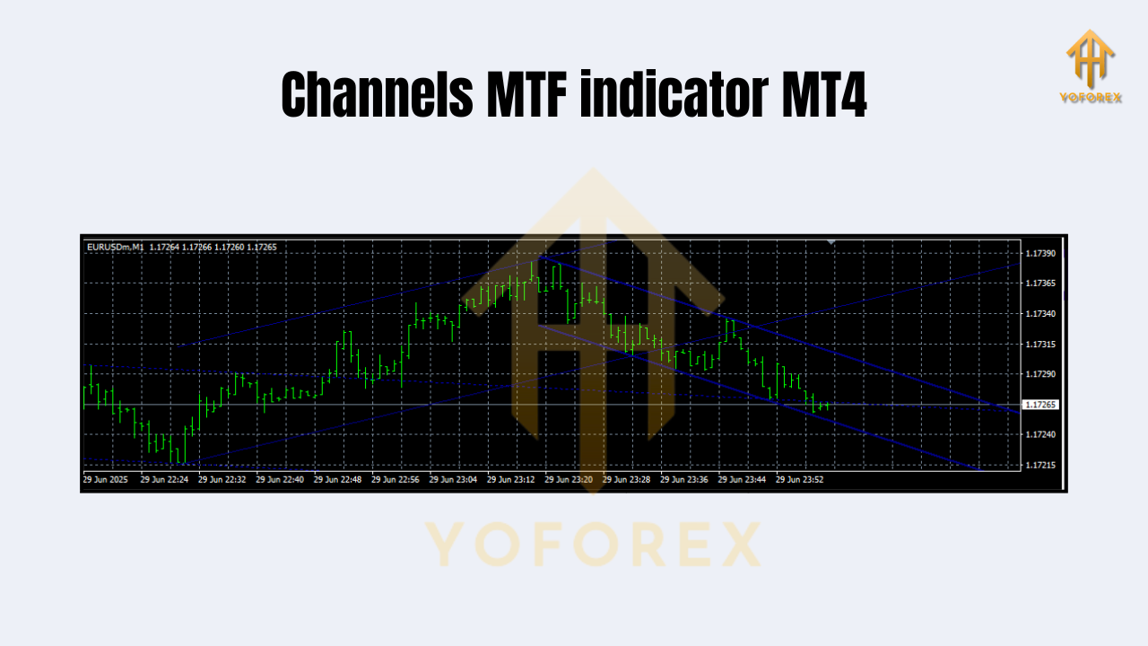Let’s say you’re trading EURUSD on the M15 chart. The Channels MTF Indicator can project channels based on H1 or H4 data directly onto your current chart. This allows you to see higher timeframe consolidation zones or trend channels without having to guess.