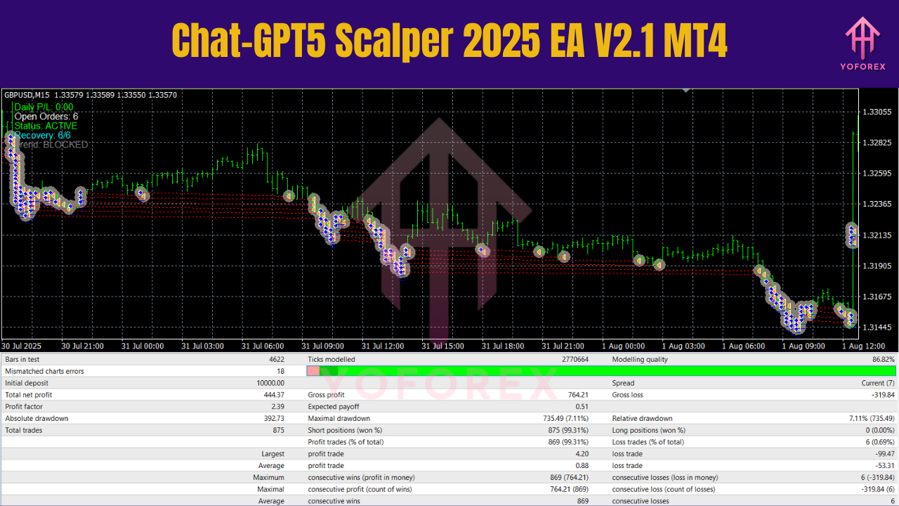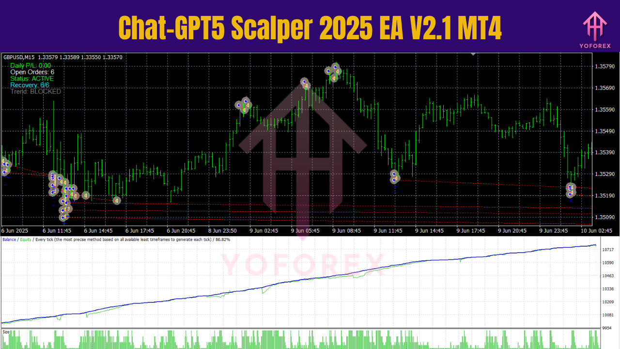 The Chat-GPT5 Scalper 2025 EA V2.1 MT4 is a high-frequency trading robot optimized for MetaTrader 4. Unlike outdated scalpers that rely on fixed rules, this EA uses AI pattern recognition to adapt to changing markets.
