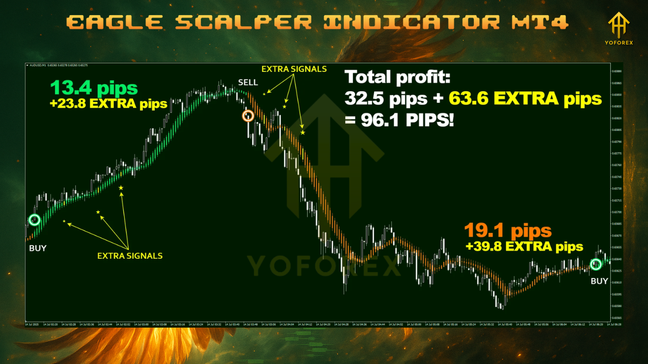 • Act only on closed-candle signals from Eagle Scalper. Do not enter mid-bar because the micro-structure on lower timeframes can change rapidly.
