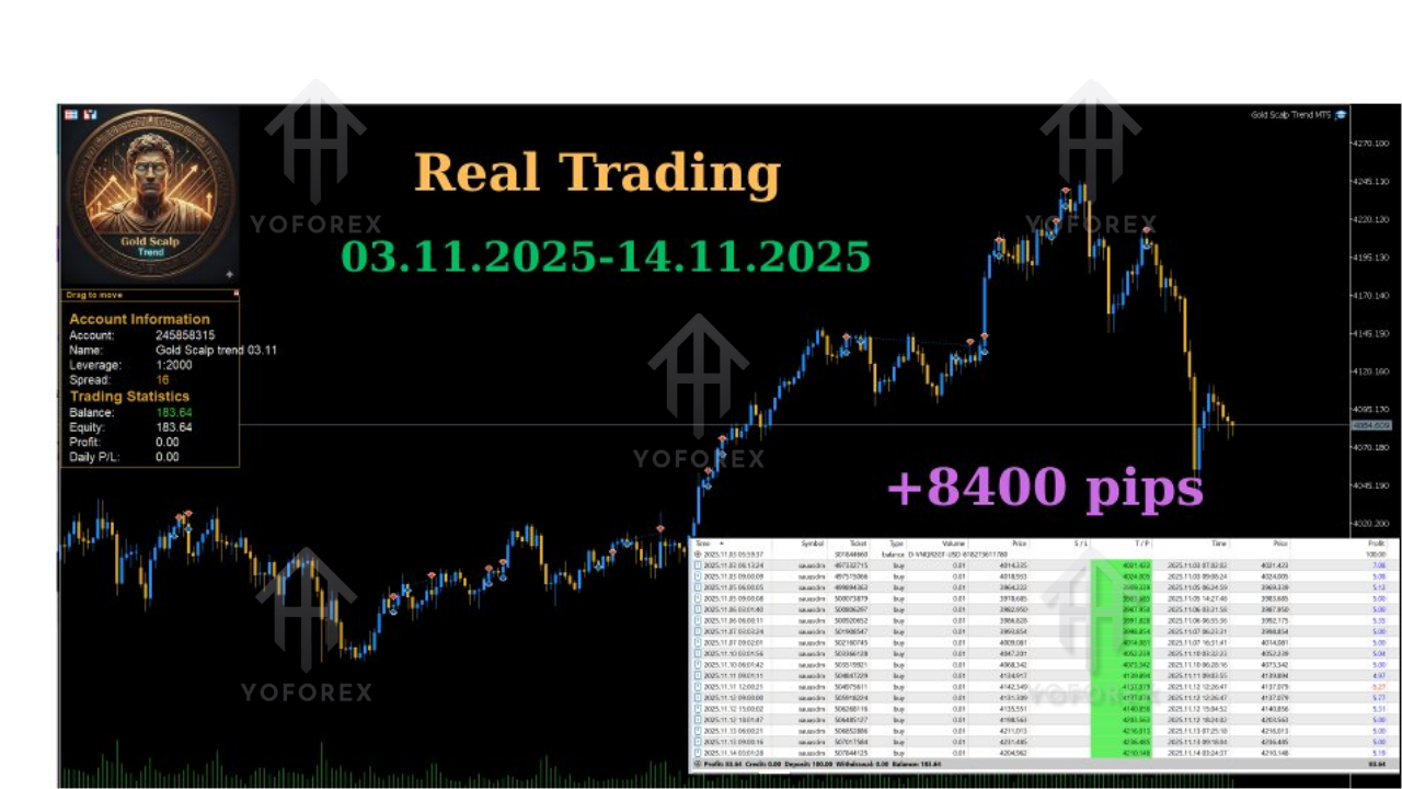 Designed by YoForex’s quantitative trading team, this EA is a pure trend-scalping engine built specifically for the XAUUSD pair. It focuses on catching micro-moves during high-volume sessions and locking in profits before gold reverses. Whether you're a beginner wanting plug-and-play automation or a pro scalper looking for consistency, this EA is built to handle the speed and chaos of gold.