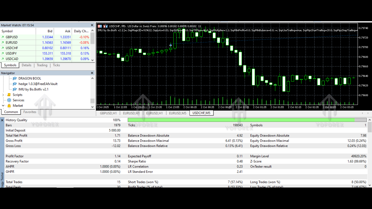 In backtesting, IMU by Bo.Botfx EA V2.1 MT5 demonstrated strong performance under various market conditions. With an average win rate of 70%, the EA performed well during trending and range-bound markets. Key backtesting results include: