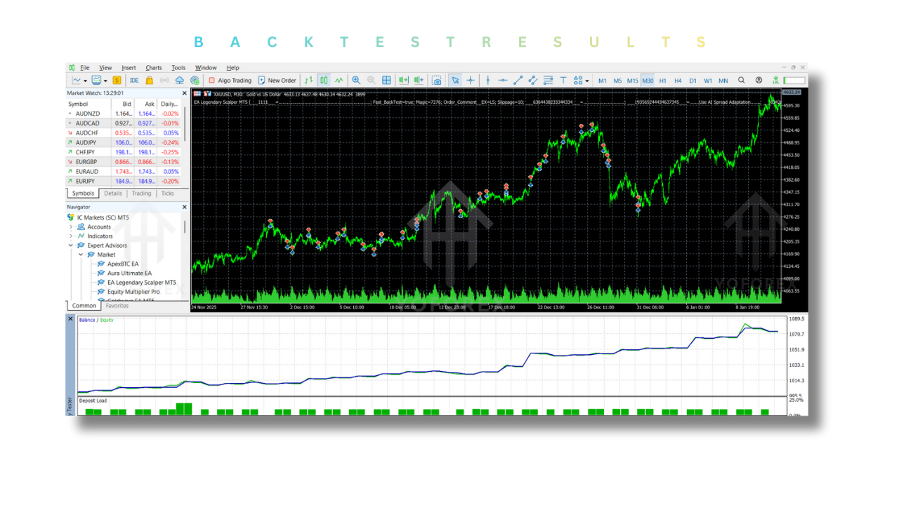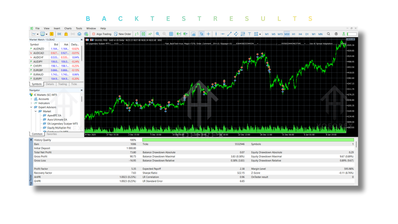 Legendary Scalper EA V152.12 MT5 is optimized for instruments known for strong intraday volatility. It performs best on markets where price movements are fast and decisive rather than slow and ranging.