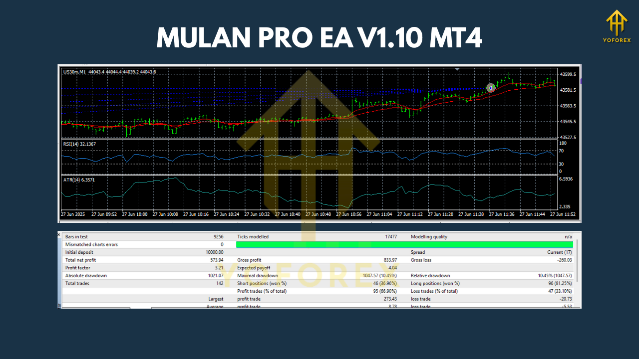 Backtesting and live-forward testing show that MULAN PRO EA has performed remarkably well across different market cycles — trending, ranging, and high-volatility phases. Using historical tick data from 2010–2025, Mulan displayed consistent profit factors above 1.8 and an average monthly ROI between 6%–12%, depending on risk settings.