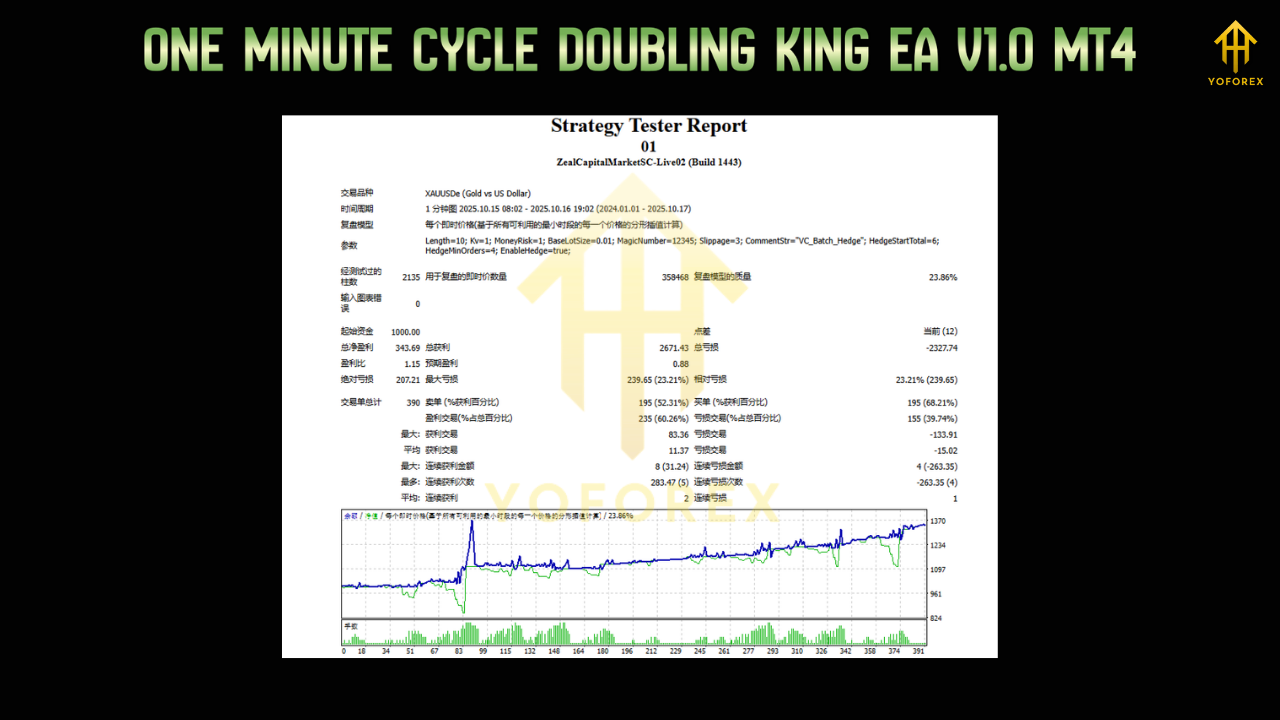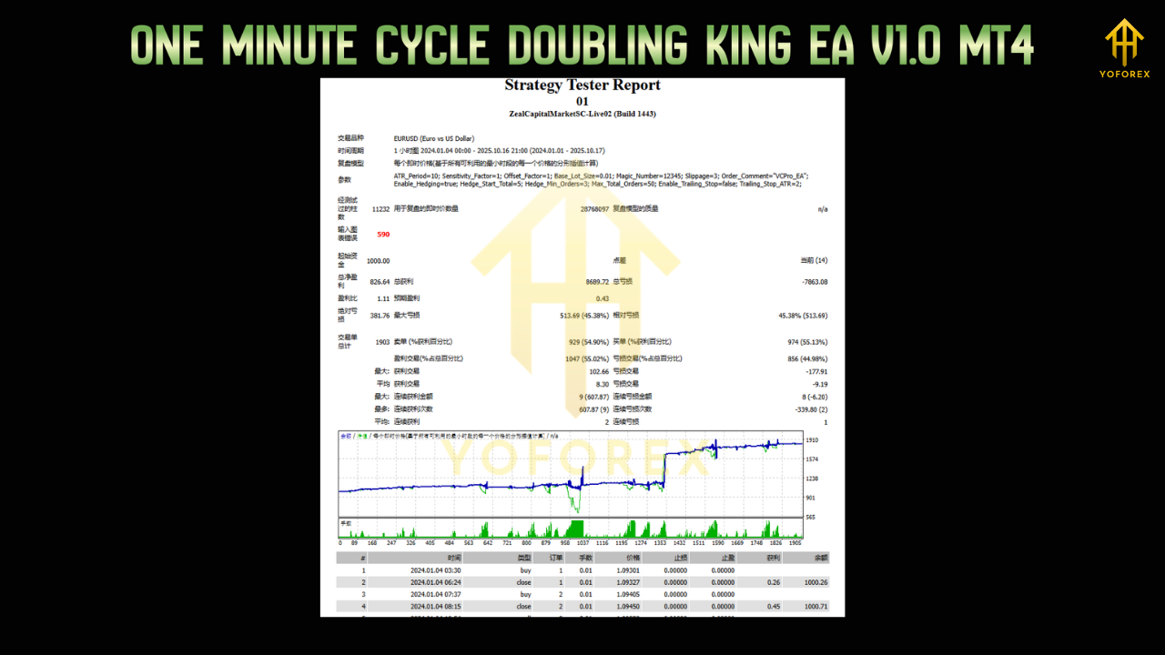In the fast-paced world of Forex trading, speed and precision are everything. The One Minute Cycle Doubling King EA V1.0 MT4 is a cutting-edge Expert Advisor (EA) designed for traders who want to maximize profits in the shortest time possible. As the name suggests, this EA operates on a one-minute cycle, making quick, high-frequency trades to take advantage of small market movements. Whether you're a scalper or a high-frequency trader, this EA is built to deliver fast results and aggressive profit growth. Let’s take a deep dive into its features, capabilities, and how it can elevate your trading strategy.