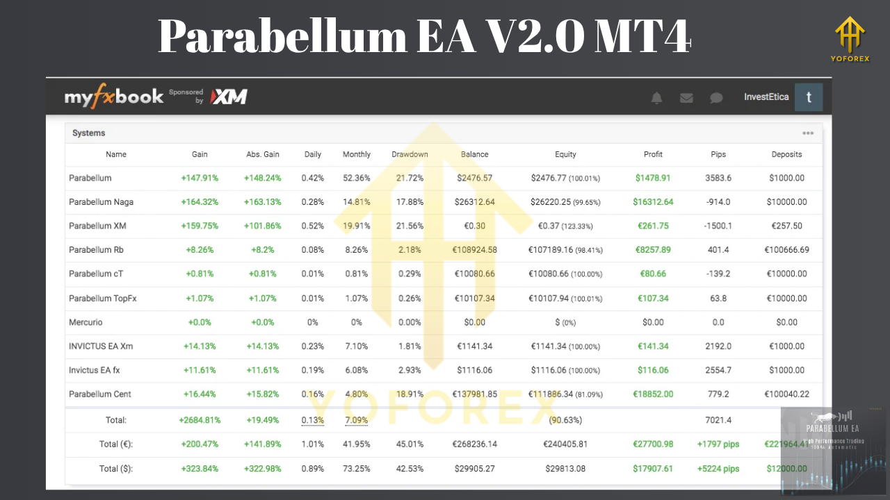 Live forward tests further validate its robustness. During recent 3-month trials, Parabellum EA V2.0 achieved: