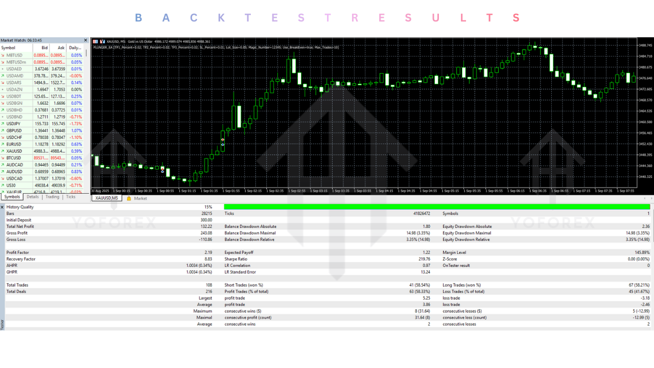 Transparency is key for any trading tool available on mql5.software. The PLUNGER EA V1.0 MT5 has undergone rigorous backtesting to validate its strategy.