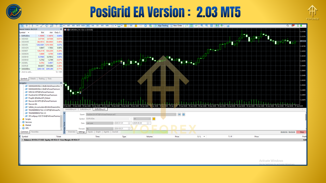 YoForex’s quant team has run PosiGrid EA V2.03 MT5 through hundreds of backtests on 5-digit tick data across multiple pairs. Typical results on EURUSD H1 from January 2018 to June 2024: