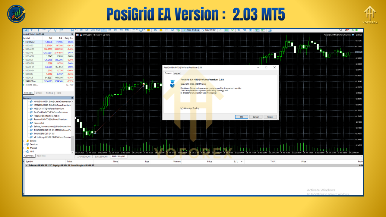 - Attach PosiGrid EA V2.03 MT5 to your desired chart (e.g., EURUSD H1).