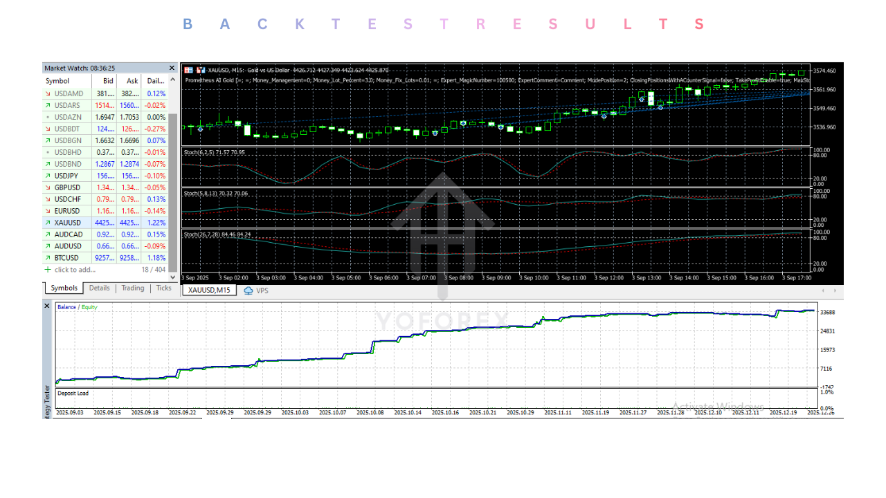 Prometheus AI Gold EA V4.99 MT5 works by analyzing real-time gold (XAUUSD) price behavior and market conditions before placing any trade. Instead of trading continuously, the bot waits patiently for high-probability setups where price structure, volatility, and timing align.