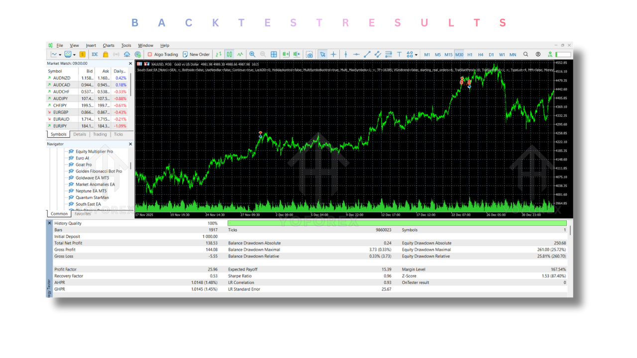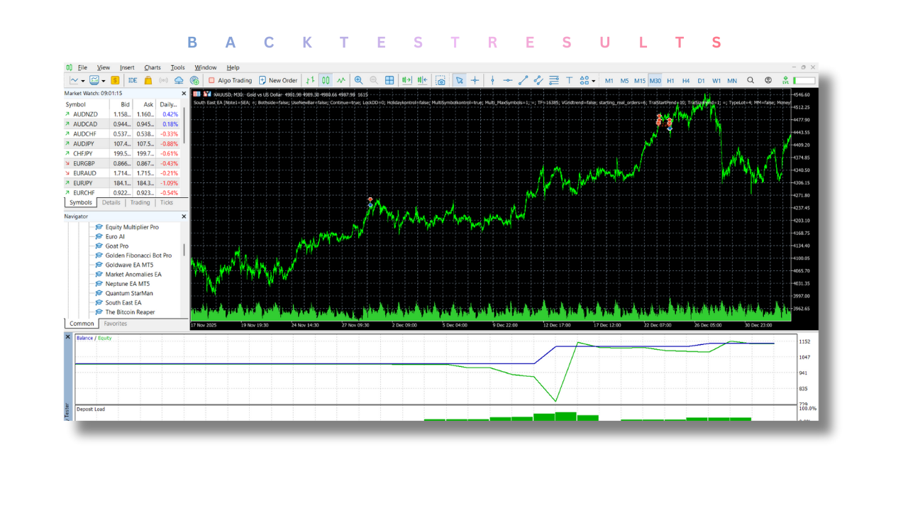 South East EA V4.40 MT5 is not designed to be evaluated solely through traditional backtesting. Due to its virtual trade logic, news filters, and multi-pair interaction, historical tests may not accurately reflect real-world performance.