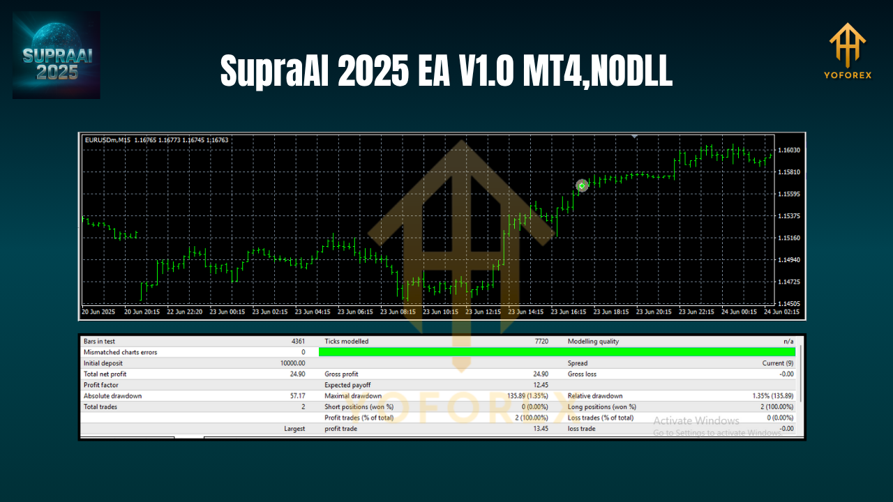 When YoForex tested SupraAI 2025 EA V1.0 on EURUSD and Gold, the results were impressive. The EA was run through a 5-year historical backtest with variable spreads, slippage, and commission simulation.