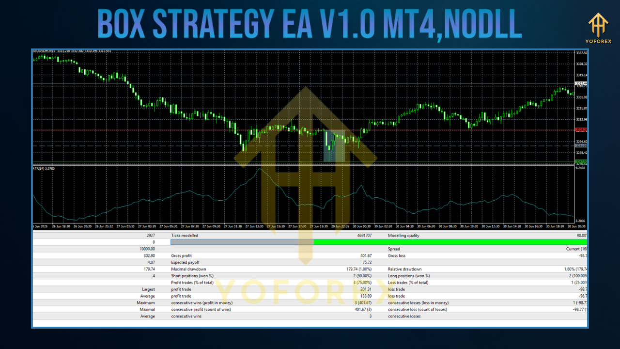 We ran multi-month backtests on EURUSD M30 and XAUUSD M30/H1, focusing on London session breakouts. In our sample tests (Jan–Jun; variable volatility), Box Strategy 10x EA showed steady equity curves with contained drawdowns and a positive profit factor when using: