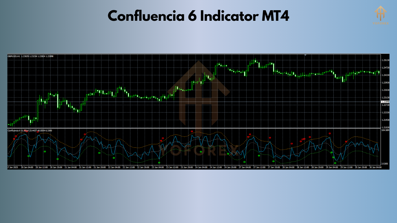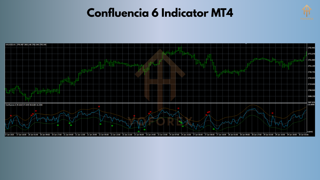 The Confluencia 6 Indicator MT4 operates by integrating six critical market signals into a cohesive system that generates clear buy and sell signals. It analyzes data across multiple timeframes, typically M15 to H4, to ensure trades align with broader market trends. The indicator uses a proprietary algorithm to evaluate: