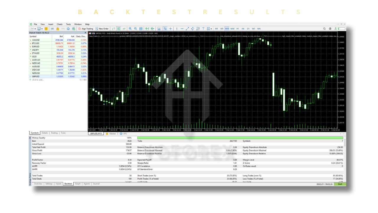 Backtesting results for Deep Frame EA V1.0 MT5 have shown strong profitability and solid risk management. Below is a summary of the backtesting results: