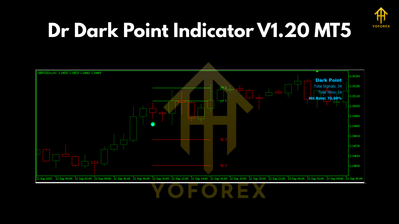 The Dr Dark Point Indicator V1.20 is a technical trading tool that combines price action analysis with advanced algorithms to generate clear signals. Unlike generic MT5 indicators, it adapts well to multiple trading conditions and focuses on delivering quality entries over quantity.