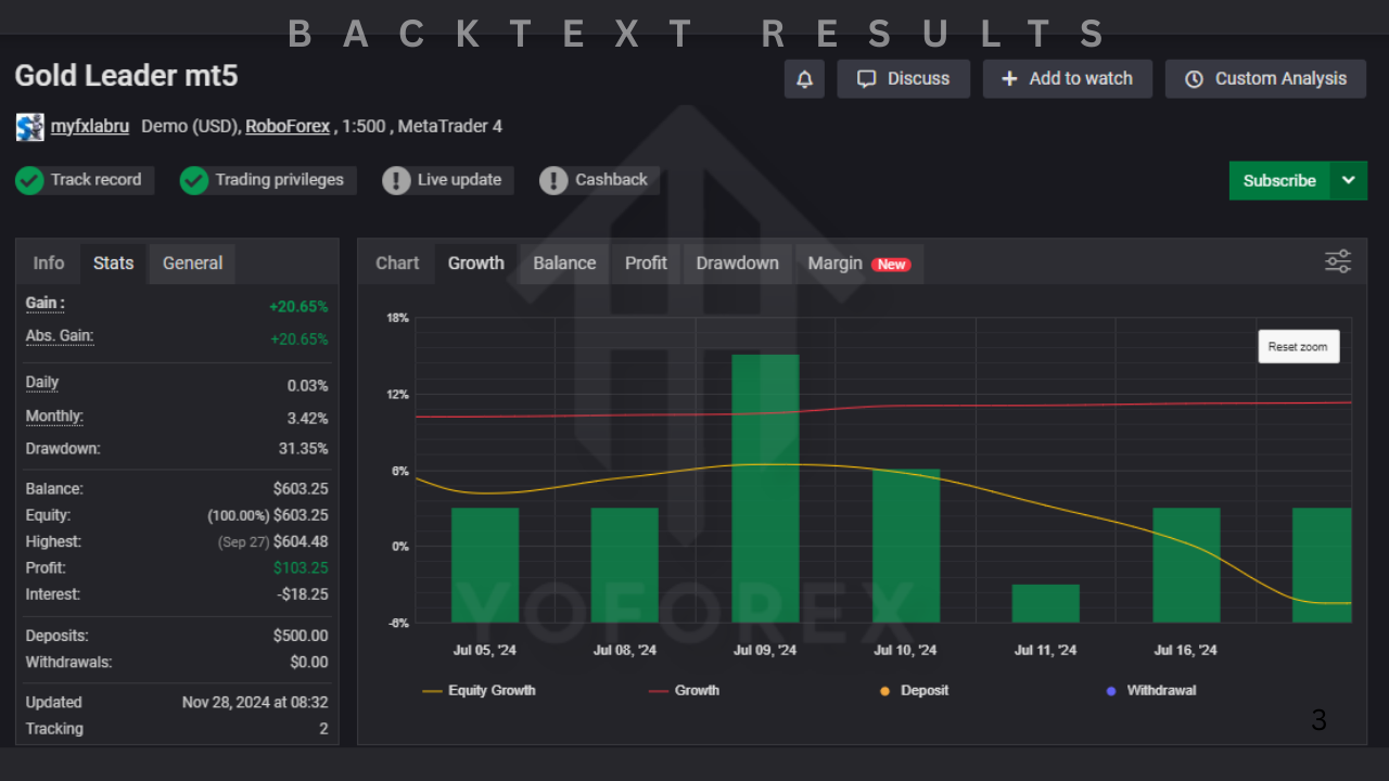 Gold Leader EA V1.0 MT5 delivers a balanced, smart, and efficient gold-trading experience for MT5 users. With its trend-following logic, volatility detection system, and adaptive risk management, the EA aims to give traders steady performance without the emotional pressures of manual trading.