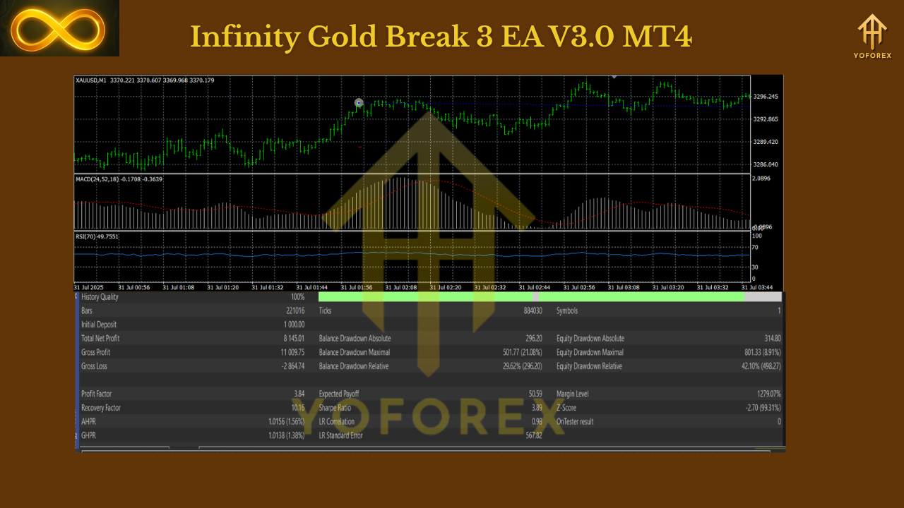 Unlike risky martingale bots, Infinity Gold Break 3 EA uses safe money management with dynamic lot sizing, candle-close confirmation, and RSI + MACD filters to keep trades clean.