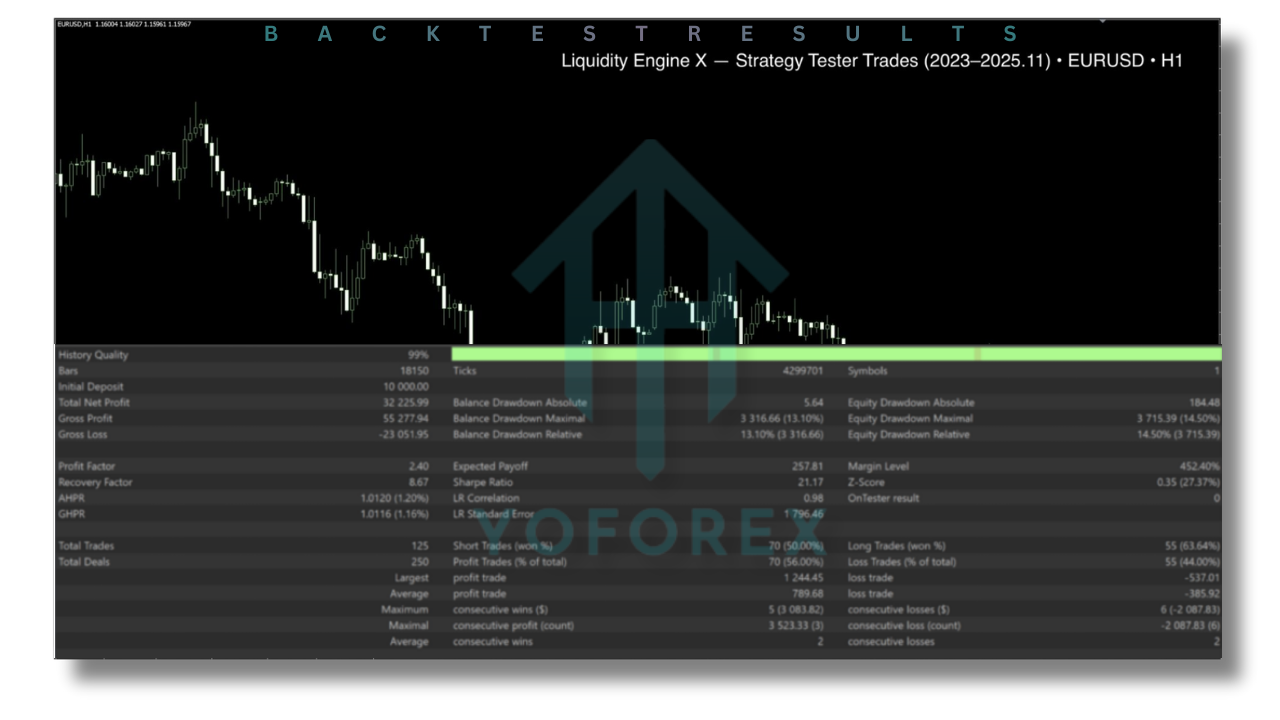 Liquidity Engine SMC ICT EA V1.15 MT4 prioritizes quality over quantity. Trades are selective, aiming for favorable risk-to-reward scenarios rather than frequent scalps.