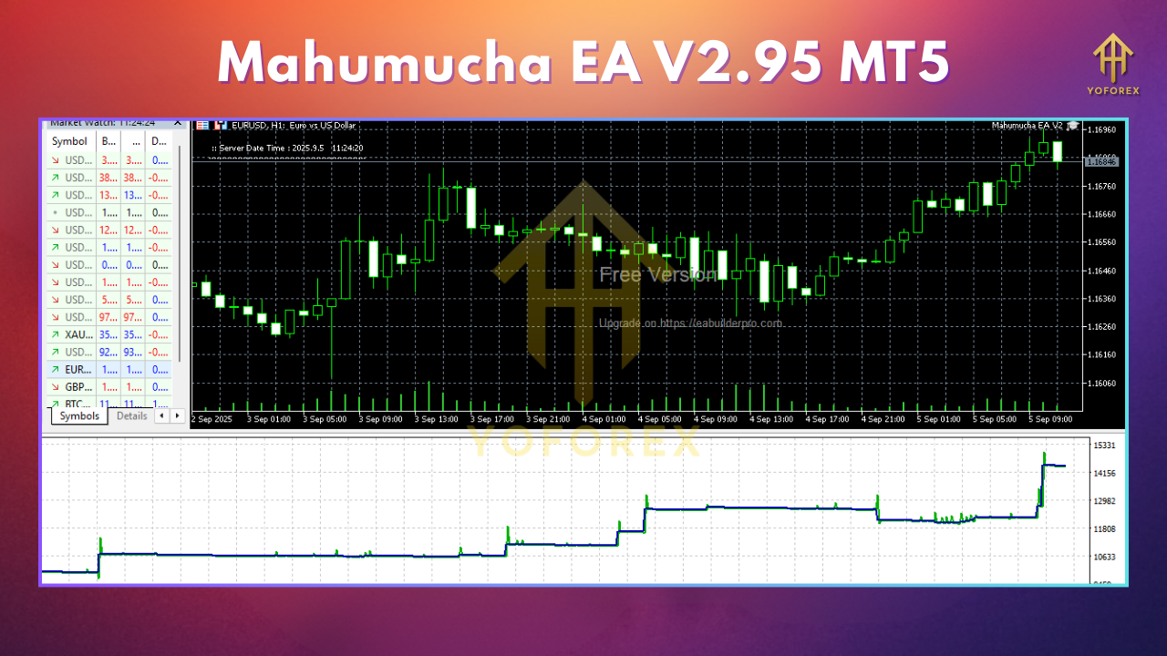 Mahumucha EA V2.95 MT5 is an automated forex expert advisor for MetaTrader 5 that uses adaptive algorithms to trade in-line with market movements. This EA trades EURUSD, GBPUSD, USDJPY, and more, following high-probability trend setups while using dynamic risk management.