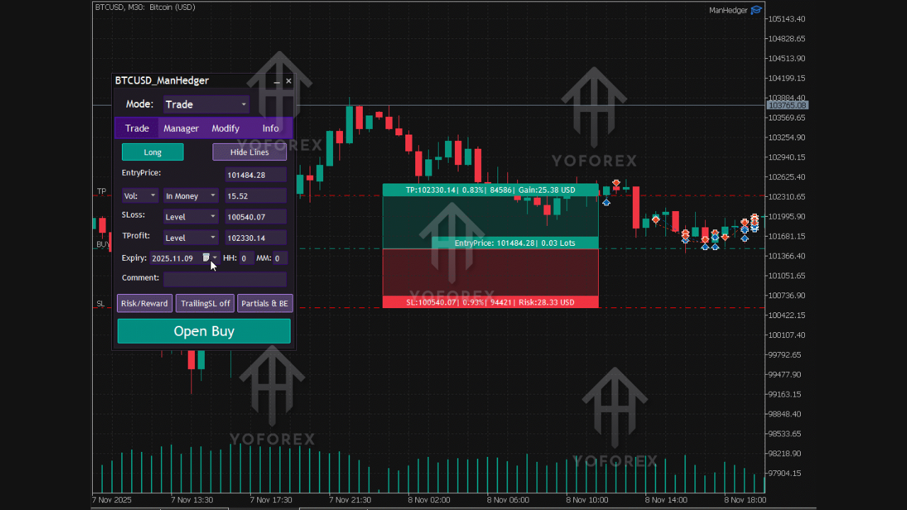 ManHedger EA V5.15 MT4 is a semi-automated trading tool, meaning it requires manual trade entry. This feature gives you complete control over when to enter the market, while the EA handles trade management once your position is open.