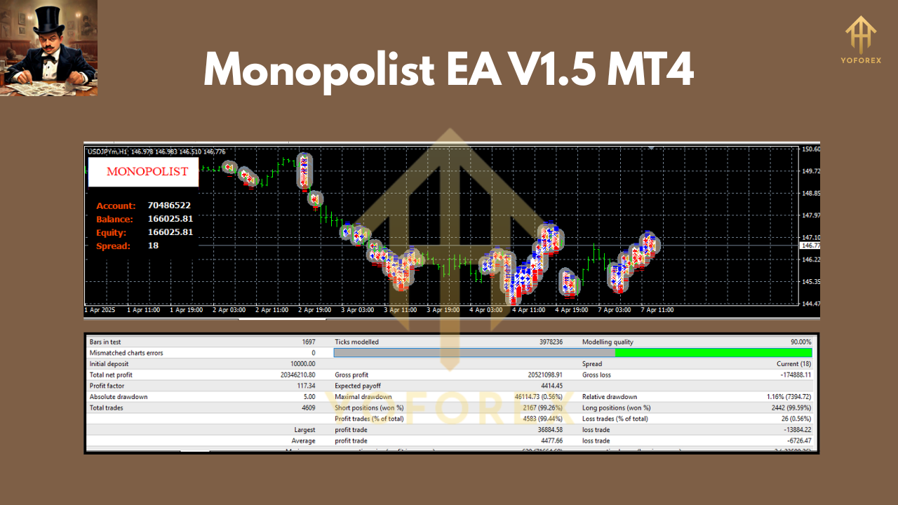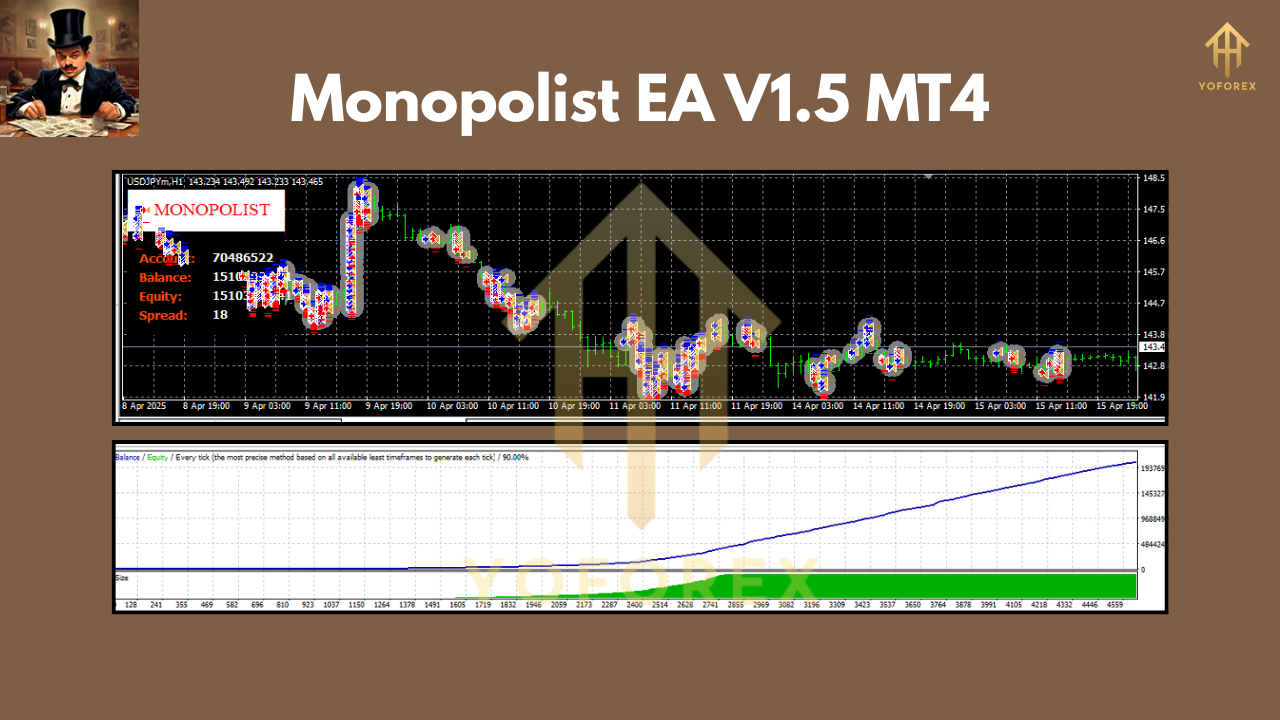 In a 24-month backtest on USDJPY (Jan 2023–Dec 2024), Monopolist EA V1.5 achieved a net return of +38.2% with a maximum drawdown of 4.5% on a $10,000 demo account. Over 1,200 trades, the profit factor registered at 1.87, reflecting disciplined trade entries and effective risk control. Equity curves remained smooth, with minimal equity spikes thanks to the built-in stop-loss mechanism. A live-market sample from Q1 2025 shows a 1.1% average monthly return, even across volatile days when spreads briefly widened—confirming the EA’s ability to adapt on the fly.