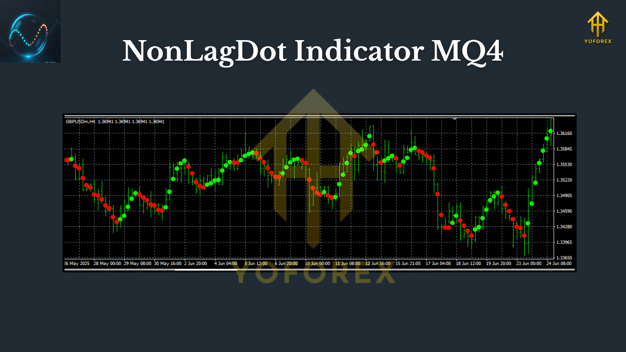 The NonLagDot Indicator is a custom-coded MT4 tool that plots colored dots above or below the candlesticks. These dots shift depending on price movement and trend direction: