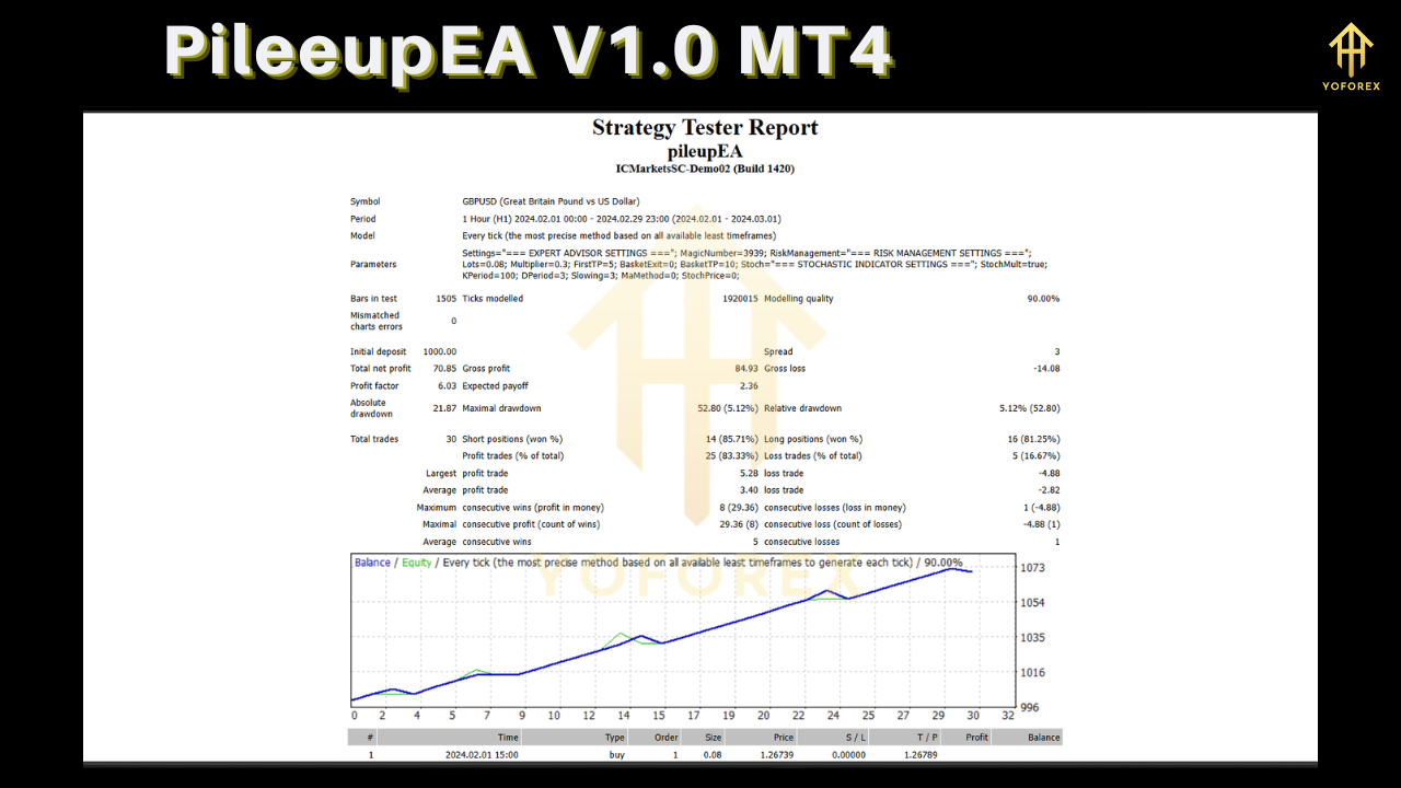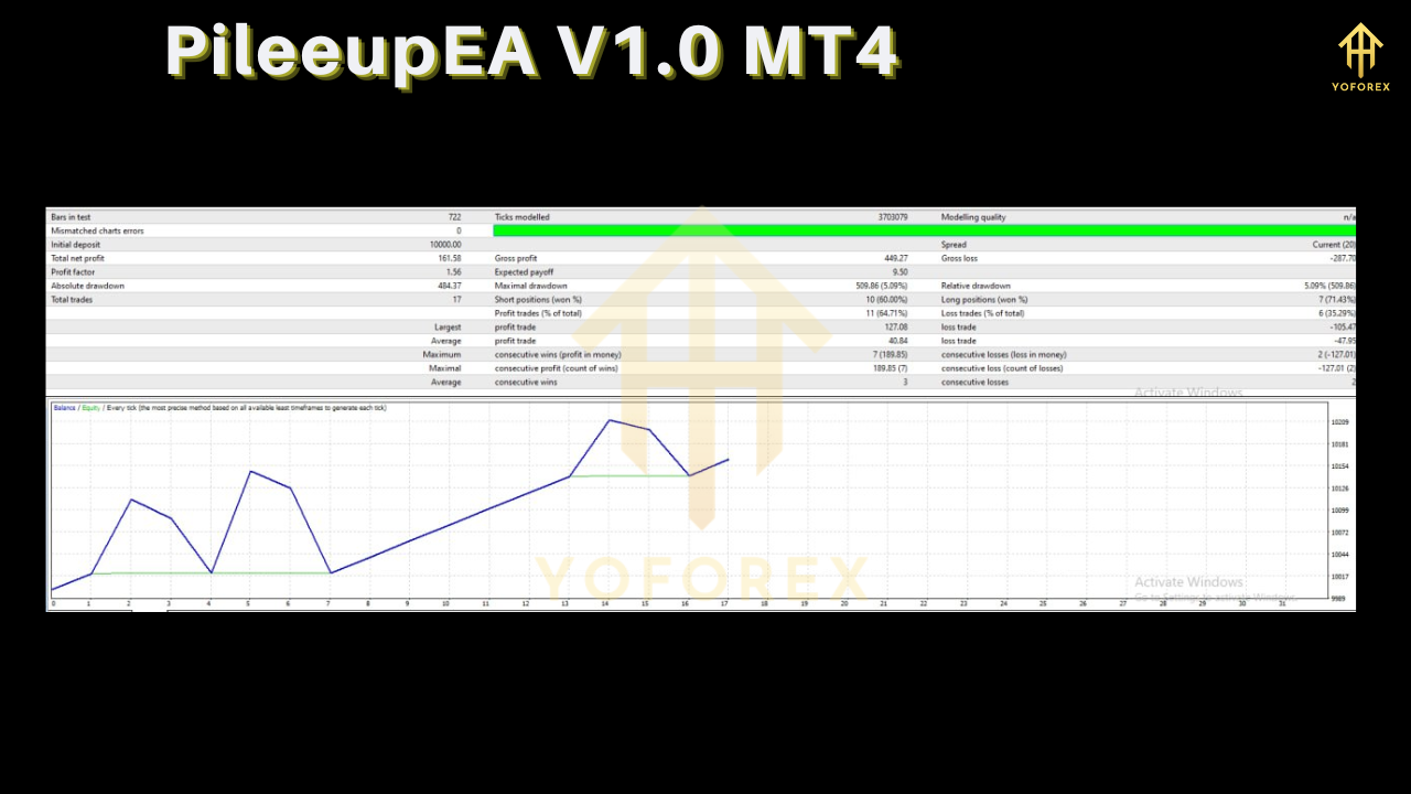 Note: Backtests are run on historical data; live performance can vary. Always demo-test PileeupEA V1.0 MT4 on your broker to confirm execution quality.