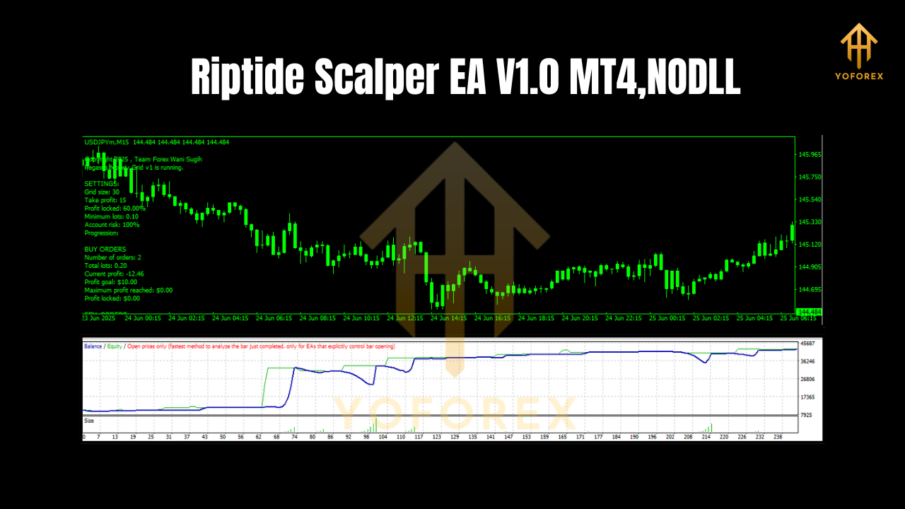 In the fast-paced world of forex trading, precision and speed are crucial for success. The Riptide Scalper EA V1.0 for MetaTrader 4 (MT4) is a cutting-edge tool designed to take advantage of short-term price movements in the forex market. This Expert Advisor (EA) is perfect for scalpers looking to optimize their trading strategies and increase their profitability with a focus on major currency pairs and even cryptocurrencies.
