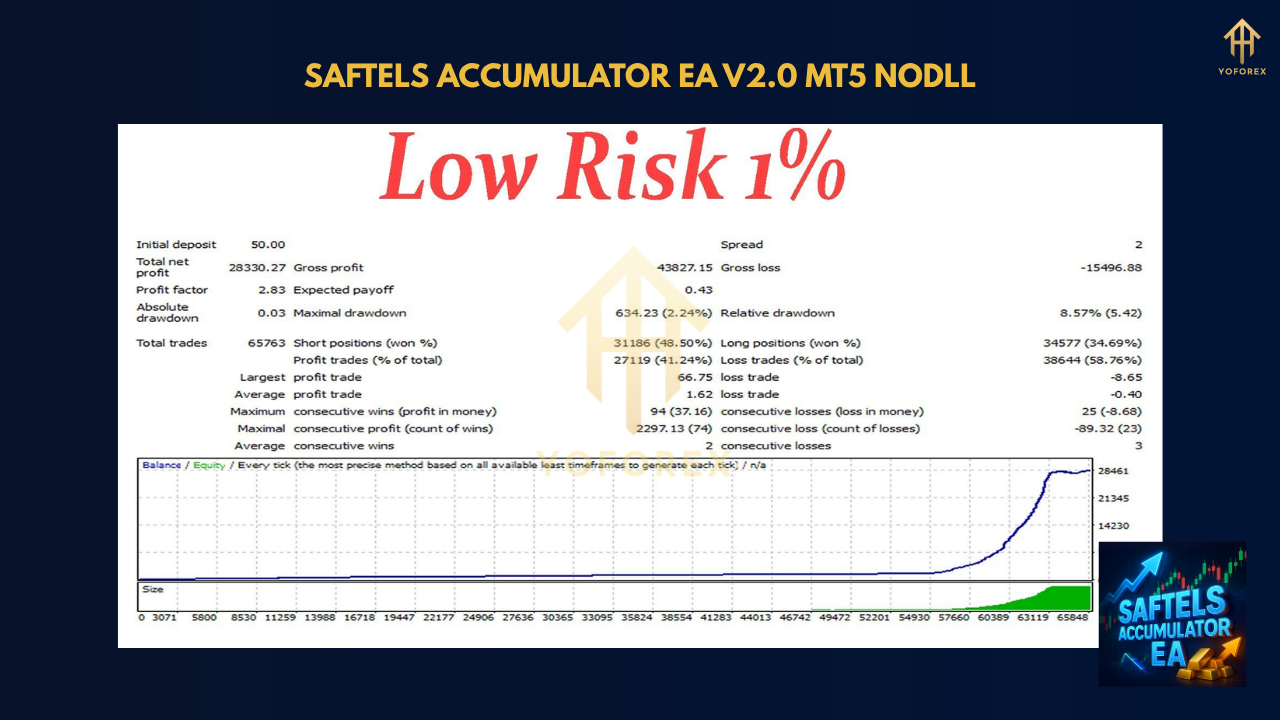 Ever felt your account drip away inch by inch, tho your entries seem spot-on? Tired of EAs that overleverage, then tank your balance when the market whipsaws? Meet Saftels Accumulator EA V2.0 MT5, a free, fully back-tested Expert Advisor built to stack small gains into big wins—without martingale, grids, or crazy drawdowns. Crafted by YoForex’s dev squad, it uses adaptive position scaling and trend filters to seize momentum on any MT5 broker. Best part? It’s 100% free on MQL5.software, with lifetime updates and zero strings attached. Ready to turn drip-drip losses into a steady accumulation of profits? Let’s break it down.