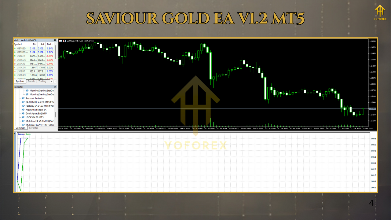 4Tired of overpriced “premium” robots that promise the moon and then ghost your account? Same. Saviour Gold EA V1.2 MT5 is our clean, no-nonsense alternative—engineered by YoForex and released free on MQL5.software so you can test, learn, and scale without paying a rupee up front. It’s built for XAUUSD (Gold) on MT5, with logic that adapts to volatility spikes, filters news-driven whipsaws, and optimizes entries during London/NY overlap—coz that’s where the juice usually is.