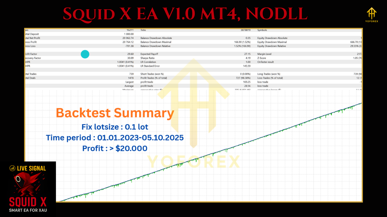 In historical backtests (2021–2024) conducted on major pairs, Squid X EA V1.0 MT4 demonstrated an average monthly return between 10–18% with a maximum drawdown under 6%.