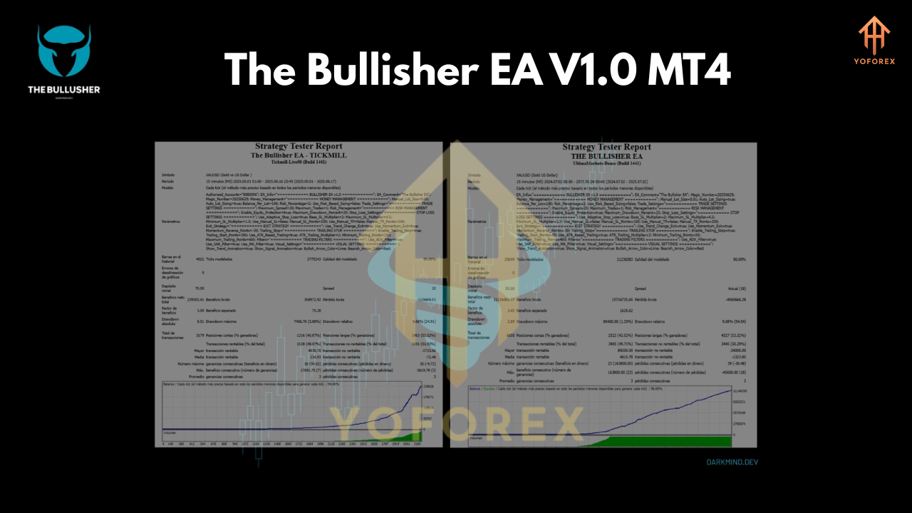 We back-tested The Bullisher EA on EURUSD from January 2015 to December 2024, using real tick data and commission/spread settings typical of an ECN broker. The sample comprised over 1,200 round-trip trades.