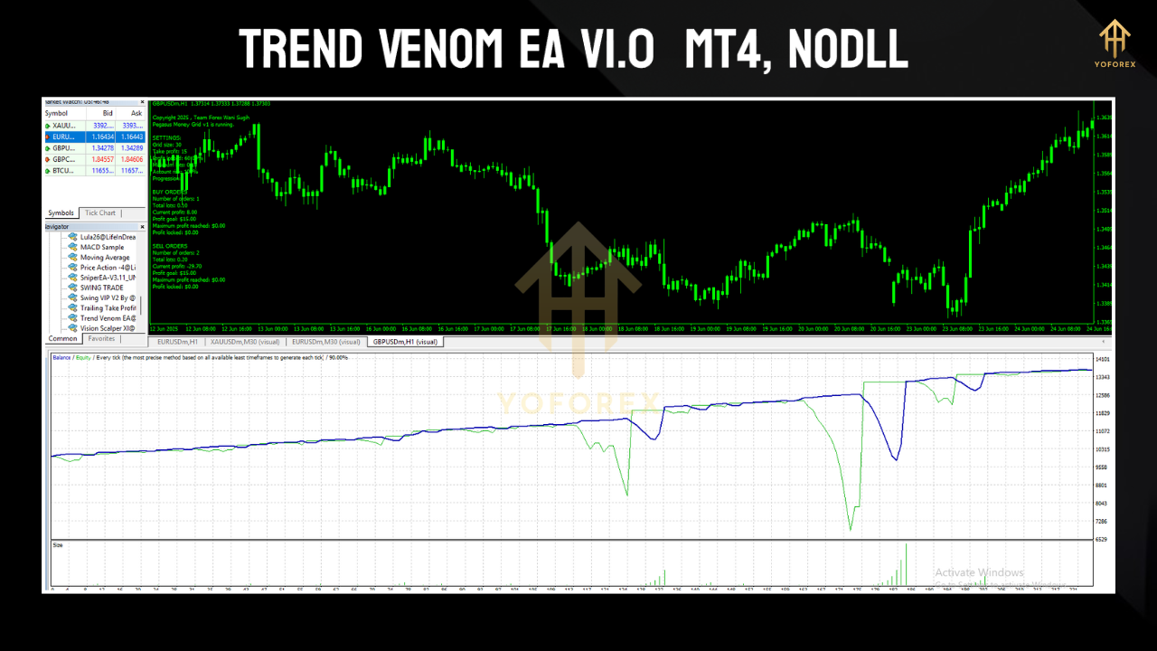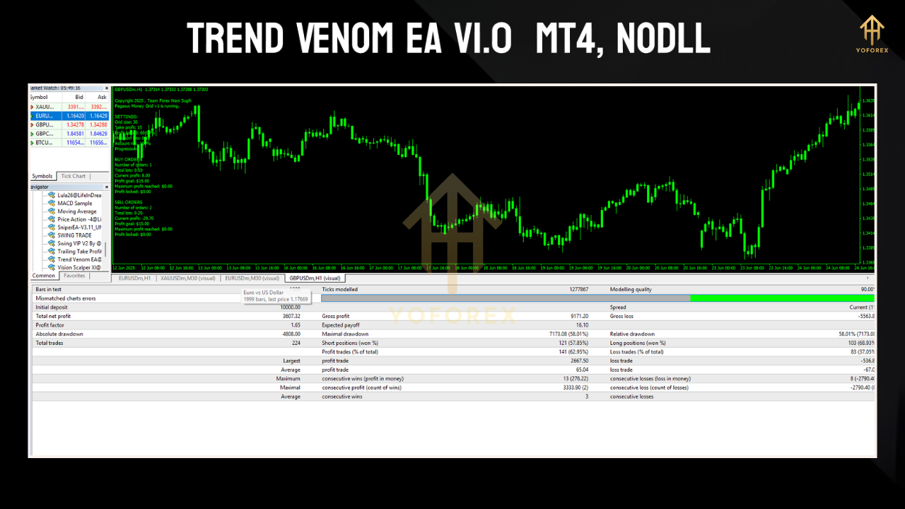The Trend Venom EA is a fully automated Expert Advisor for MetaTrader 4 that focuses on trend detection, rapid trade execution, and controlled exits. It uses a combination of momentum confirmation, volatility filters, and multi-timeframe alignment to ensure entries are both fast and accurate.