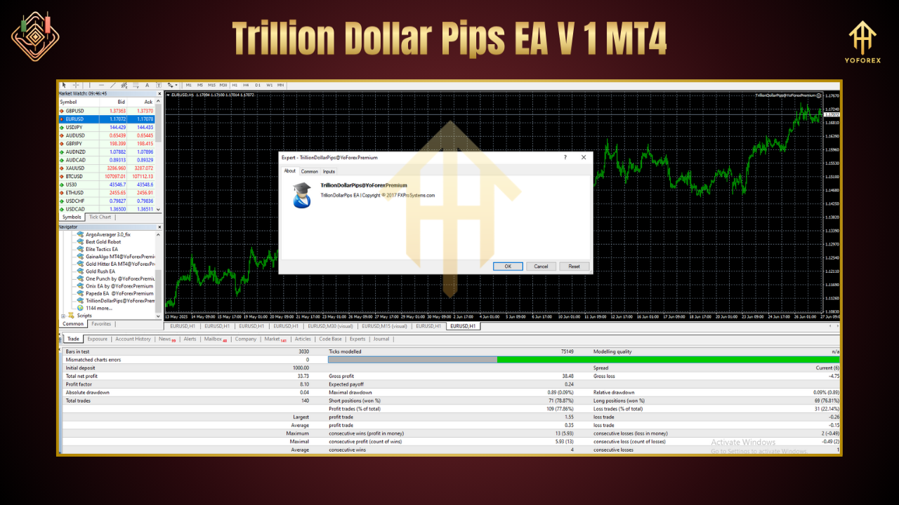 Built and back-tested by YoForex’s quant team, Trillion Dollar Pips EA V1 MT4 is ideal for forex pairs like EURUSD, GBPUSD, USDJPY, and XAUUSD. You’ll get smooth returns, minimal drawdowns, and the freedom to tweak everything: pip distance, lot increments, max open levels, trading hours—you name it.